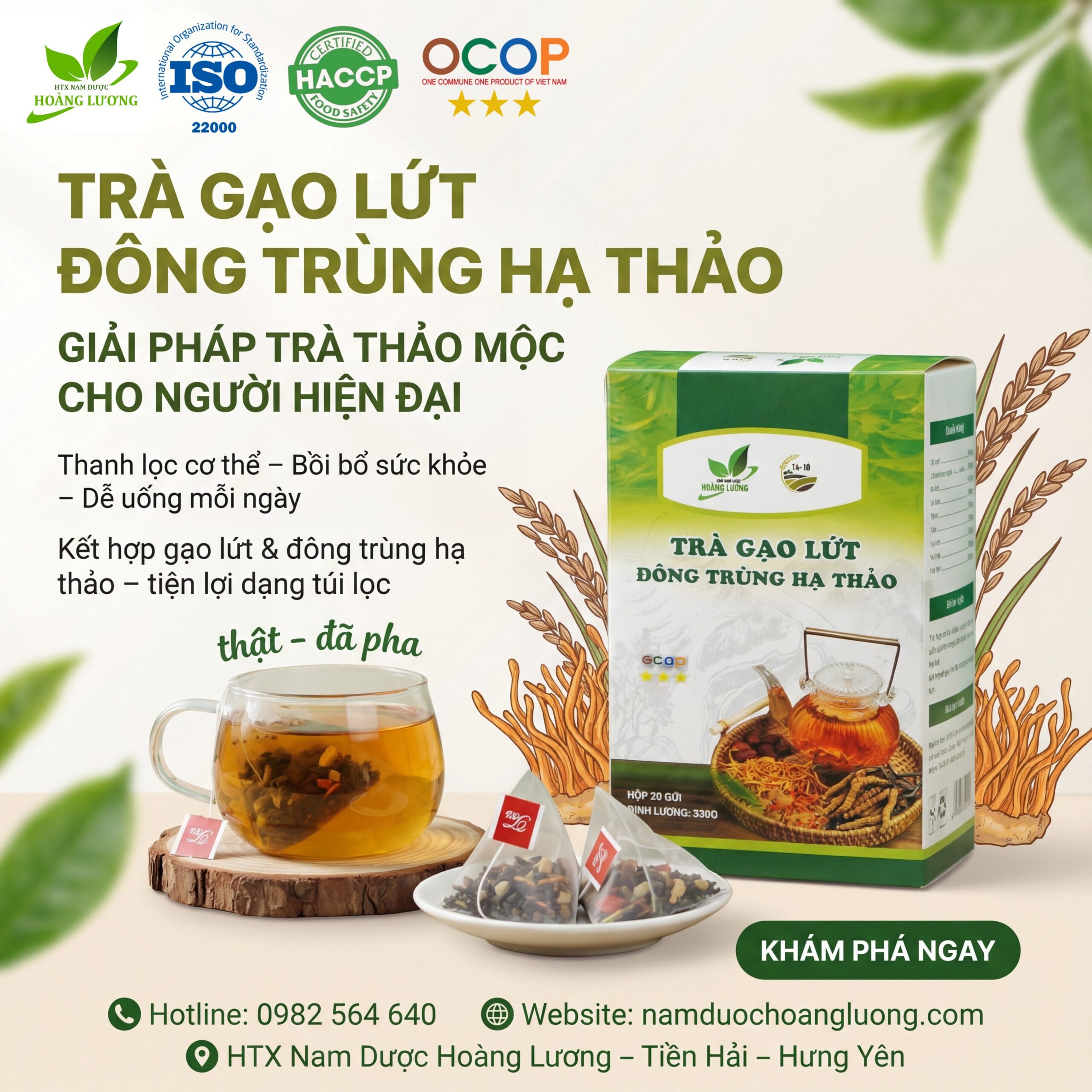Trà gạo lứt đông trùng hạ thảo là dòng trà thảo mộc dưỡng sinh được HTX Nam Dược Hoàng Lương nghiên cứu, phối trộn và sản xuất trên cơ sở y học cổ truyền kết hợp công nghệ hiện đại. Sản phẩm hướng tới giá trị uống trà lành – chăm sóc cơ thể tự nhiên, phù hợp sử dụng lâu dài trong sinh hoạt hằng ngày.